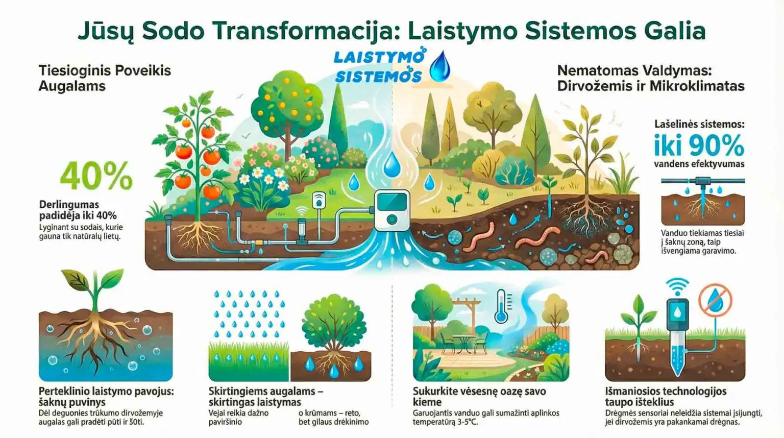 Norint, kad sodas klestėtų, nepakanka tiesiog įjungti vandenį. Reikia žinoti, kaip tai daryti išmaniai. Šiuolaikinės technologijos leidžia pasiekti, kad laistymo sistemos veiktų beveik be žmogaus įsikišimo, tačiau duotų maksimalią naudą. Čia svarbiausia yra balansas tarp resursų taupymo ir augalų poreikių tenkinimo.